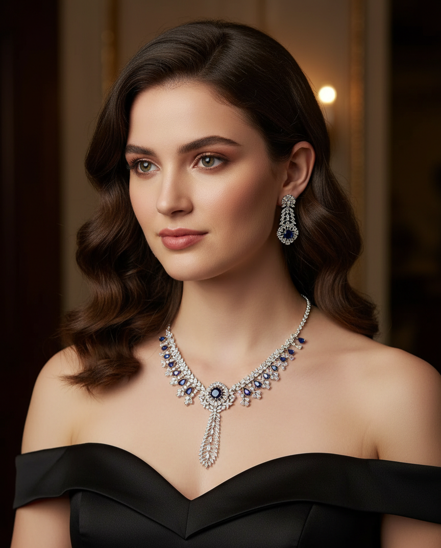Our American Diamond Necklace Sets feature a wide range of elegant designs, from classic and traditional to modern and contemporary styles, crafted to suit every occasion and outfit. Made with high-quality American diamonds that deliver a brilliant, diamond-like sparkle, each set includes a beautifully designed necklace with matching earrings.Lightweight, skin-friendly, and comfortable to wear, these versatile sets are ideal for weddings, parties, festivals, formal events, and everyday elegance, offering a luxurious look at an affordable price and making them a perfect choice for both personal wear and gifting.