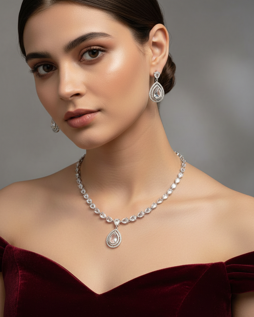 Our American Diamond Necklace Sets feature a wide range of elegant designs, from classic and traditional to modern and contemporary styles, crafted to suit every occasion and outfit. Made with high-quality American diamonds that deliver a brilliant, diamond-like sparkle, each set includes a beautifully designed necklace with matching earrings.Lightweight, skin-friendly, and comfortable to wear, these versatile sets are ideal for weddings, parties, festivals, formal events, and everyday elegance, offering a luxurious look at an affordable price and making them a perfect choice for both personal wear and gifting.