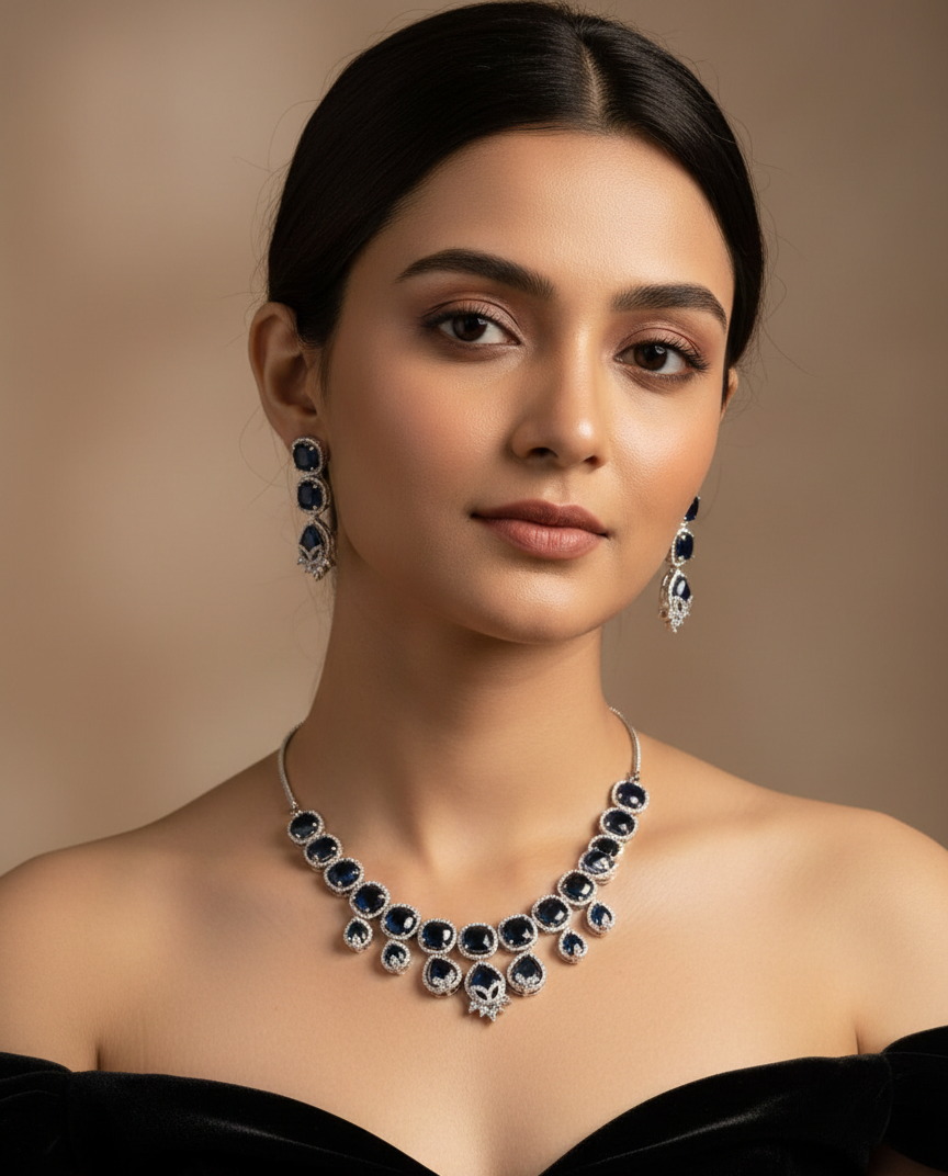 Our American Diamond Necklace Sets feature a wide range of elegant designs, from classic and traditional to modern and contemporary styles, crafted to suit every occasion and outfit. Made with high-quality American diamonds that deliver a brilliant, diamond-like sparkle, each set includes a beautifully designed necklace with matching earrings.Lightweight, skin-friendly, and comfortable to wear, these versatile sets are ideal for weddings, parties, festivals, formal events, and everyday elegance, offering a luxurious look at an affordable price and making them a perfect choice for both personal wear and gifting.