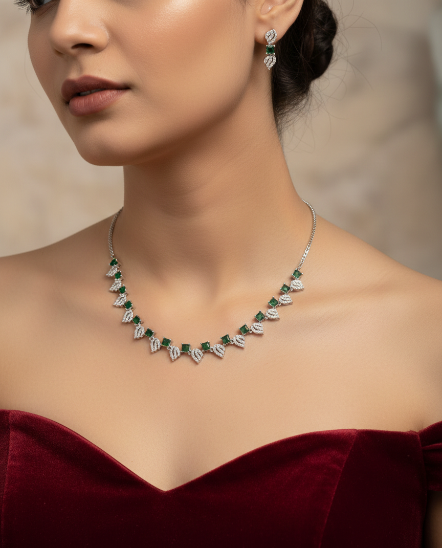 Our American Diamond Necklace Sets feature a wide range of elegant designs, from classic and traditional to modern and contemporary styles, crafted to suit every occasion and outfit. Made with high-quality American diamonds that deliver a brilliant, diamond-like sparkle, each set includes a beautifully designed necklace with matching earrings.Lightweight, skin-friendly, and comfortable to wear, these versatile sets are ideal for weddings, parties, festivals, formal events, and everyday elegance, offering a luxurious look at an affordable price and making them a perfect choice for both personal wear and gifting.