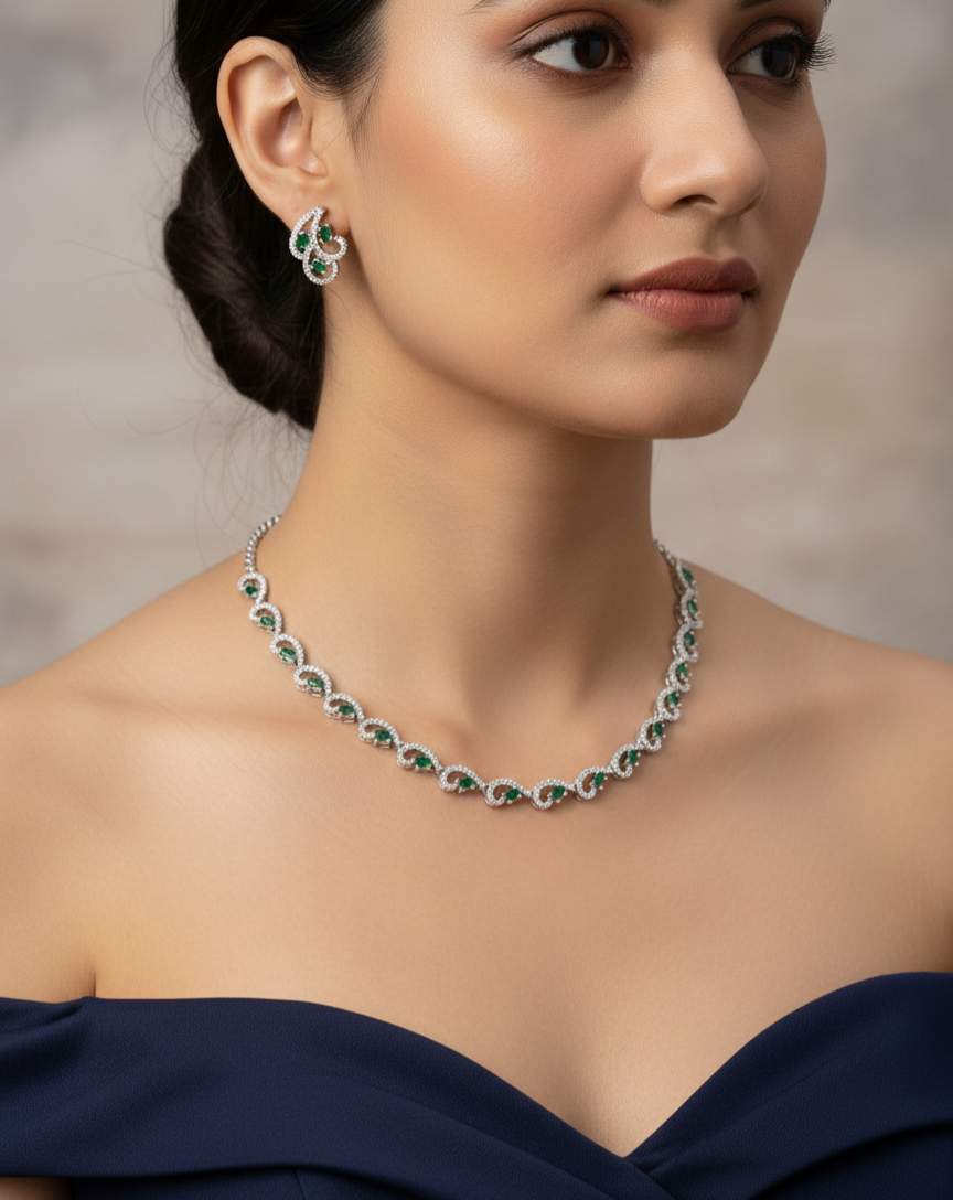 Our American Diamond Necklace Sets feature a wide range of elegant designs, from classic and traditional to modern and contemporary styles, crafted to suit every occasion and outfit. Made with high-quality American diamonds that deliver a brilliant, diamond-like sparkle, each set includes a beautifully designed necklace with matching earrings.Lightweight, skin-friendly, and comfortable to wear, these versatile sets are ideal for weddings, parties, festivals, formal events, and everyday elegance, offering a luxurious look at an affordable price and making them a perfect choice for both personal wear and gifting.