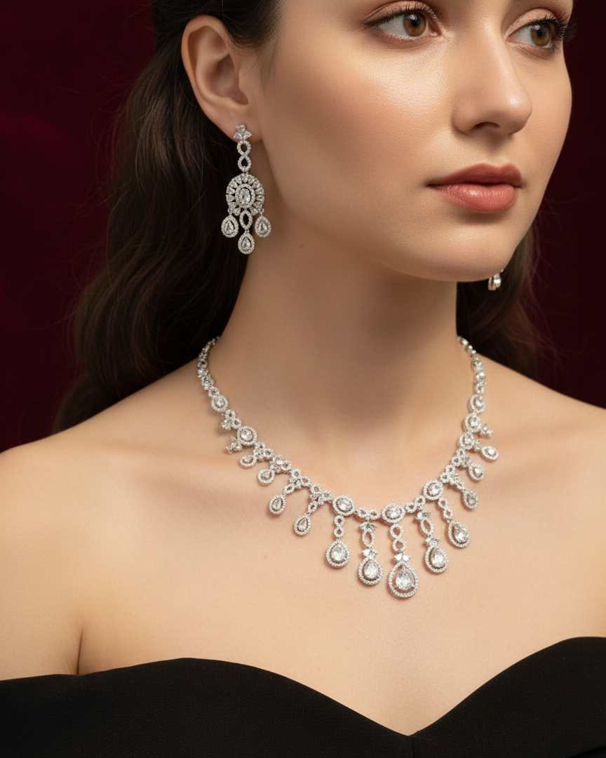 Our American Diamond Necklace Sets feature a wide range of elegant designs, from classic and traditional to modern and contemporary styles, crafted to suit every occasion and outfit. Made with high-quality American diamonds that deliver a brilliant, diamond-like sparkle, each set includes a beautifully designed necklace with matching earrings.Lightweight, skin-friendly, and comfortable to wear, these versatile sets are ideal for weddings, parties, festivals, formal events, and everyday elegance, offering a luxurious look at an affordable price and making them a perfect choice for both personal wear and gifting.