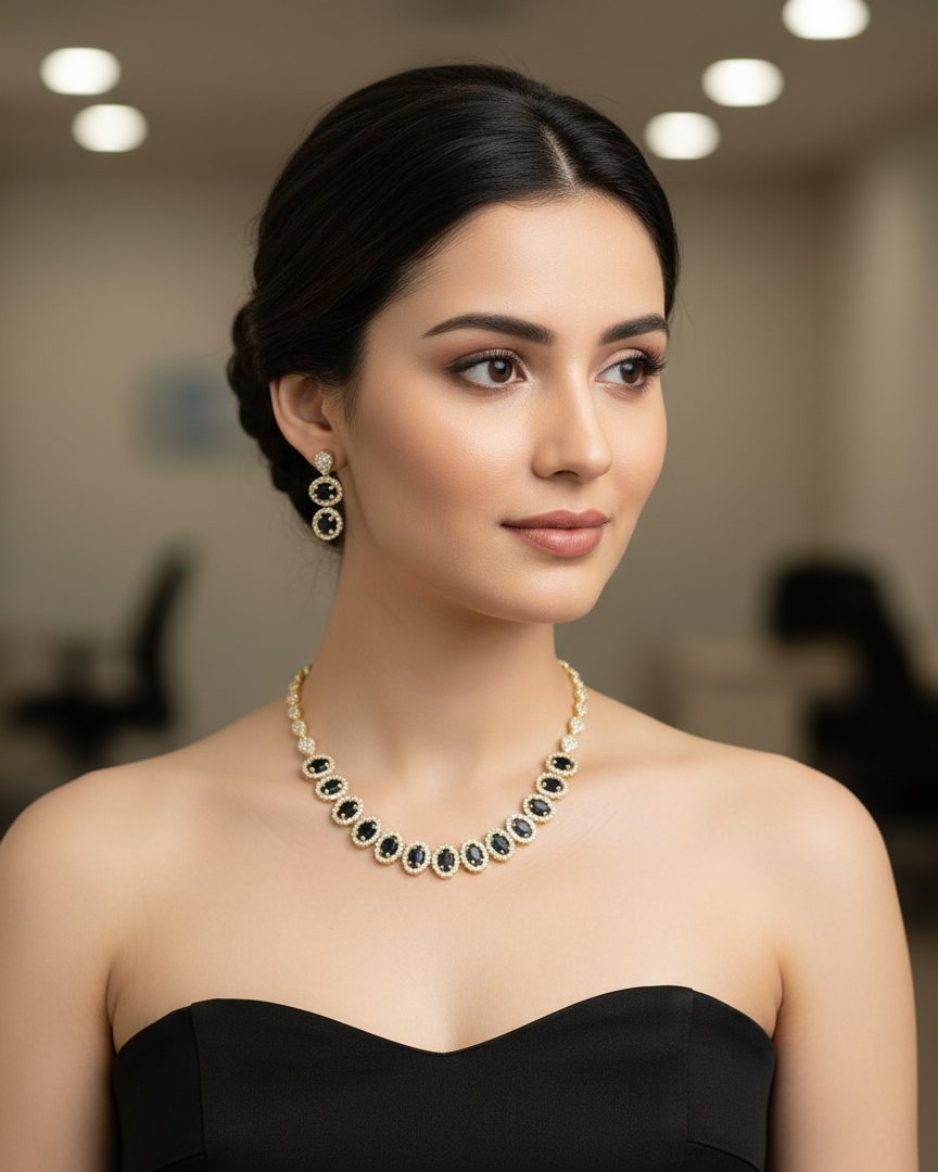 Our American Diamond Necklace Sets feature a wide range of elegant designs, from classic and traditional to modern and contemporary styles, crafted to suit every occasion and outfit. Made with high-quality American diamonds that deliver a brilliant, diamond-like sparkle, each set includes a beautifully designed necklace with matching earrings.Lightweight, skin-friendly, and comfortable to wear, these versatile sets are ideal for weddings, parties, festivals, formal events, and everyday elegance, offering a luxurious look at an affordable price and making them a perfect choice for both personal wear and gifting.