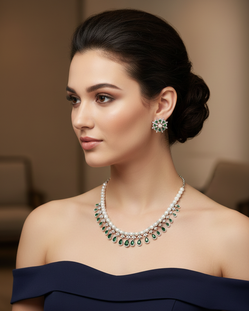 Our American Diamond Necklace Sets feature a wide range of elegant designs, from classic and traditional to modern and contemporary styles, crafted to suit every occasion and outfit. Made with high-quality American diamonds that deliver a brilliant, diamond-like sparkle, each set includes a beautifully designed necklace with matching earrings.Lightweight, skin-friendly, and comfortable to wear, these versatile sets are ideal for weddings, parties, festivals, formal events, and everyday elegance, offering a luxurious look at an affordable price and making them a perfect choice for both personal wear and gifting.