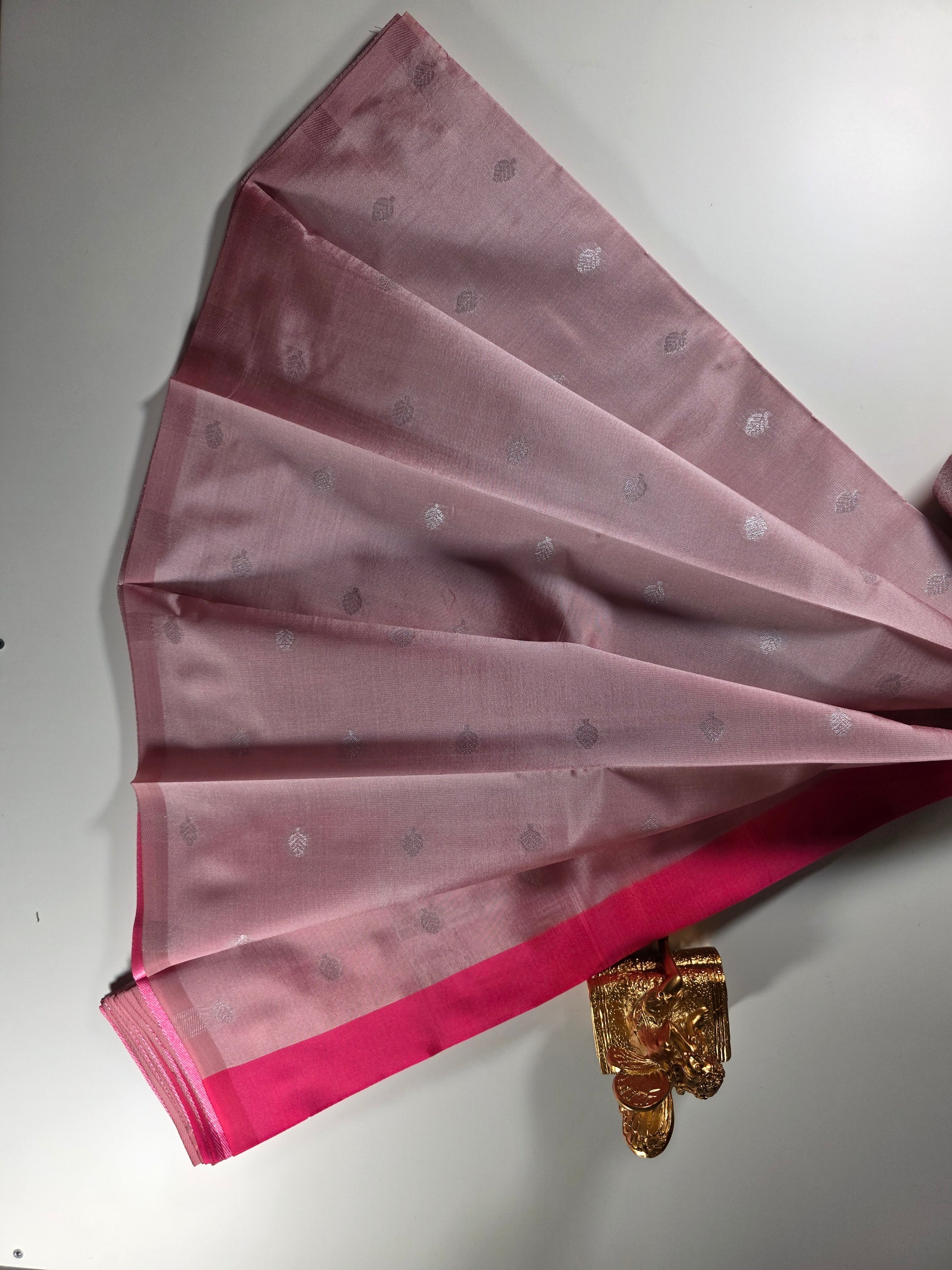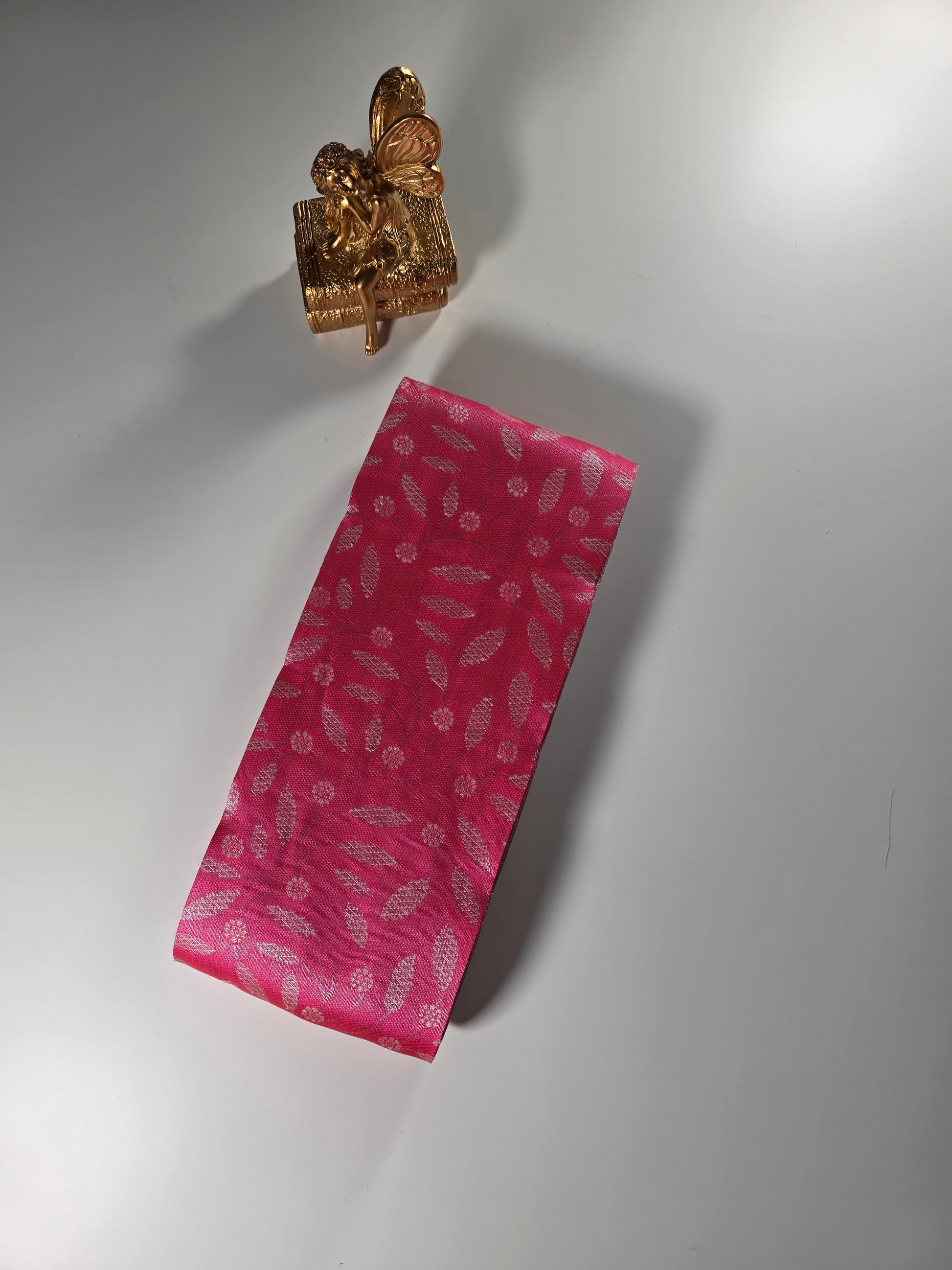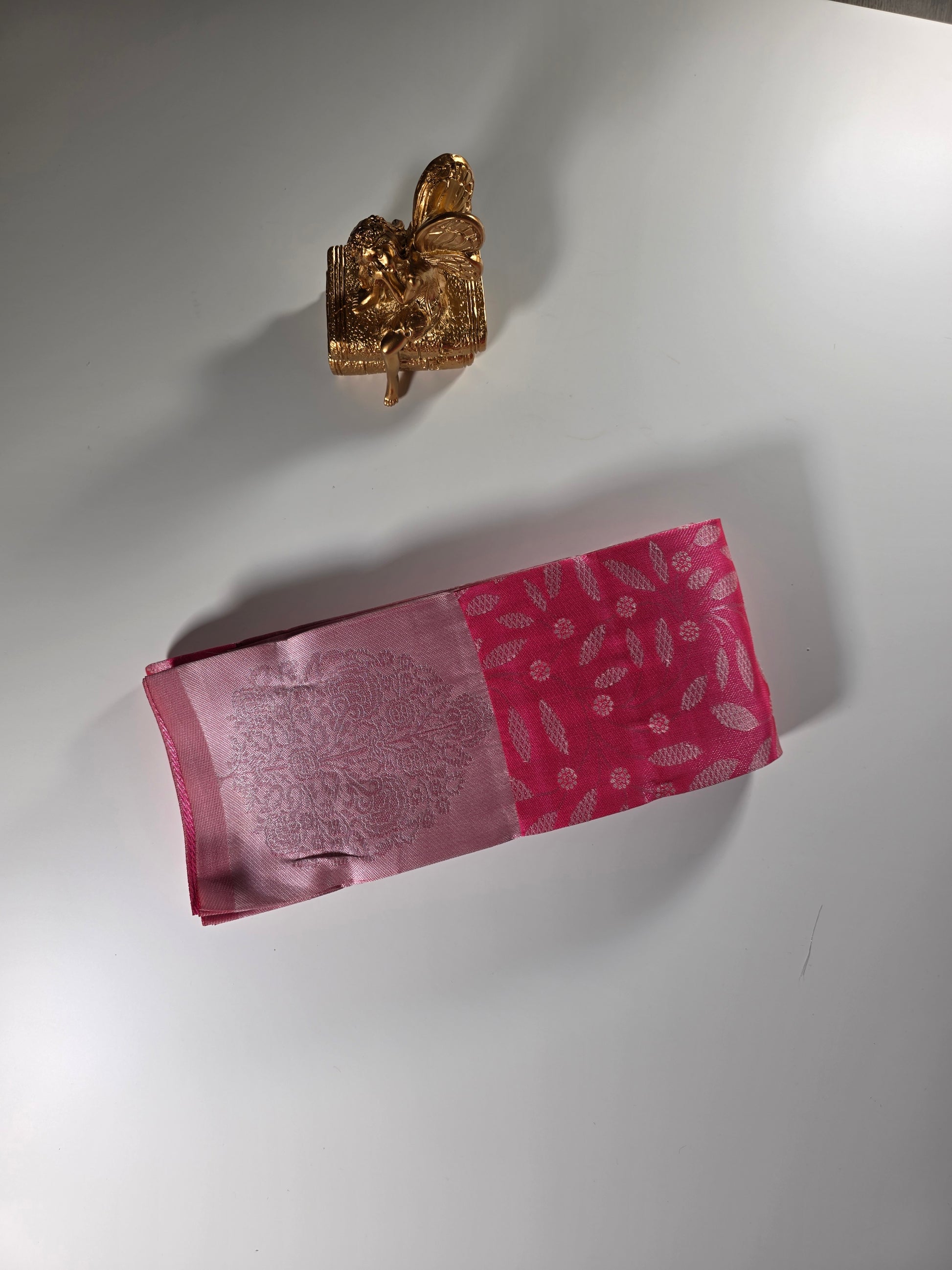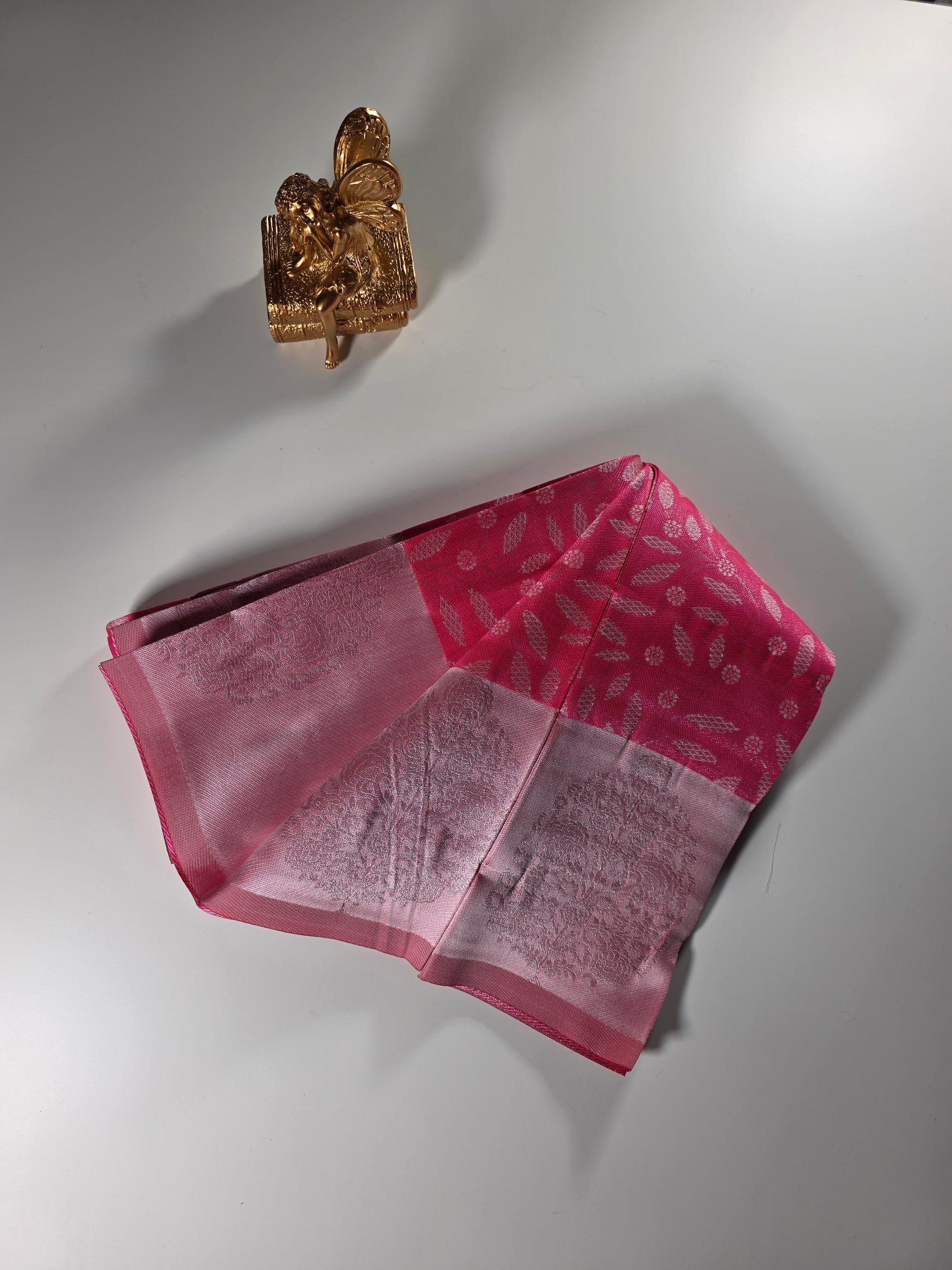 The saree features a beautiful combination of shades of pink. The main body appears to be a vibrant, rich fuchsia or deep rose pink, adorned with delicate, lighter pink motifs that almost look like leaves or small floral patterns.