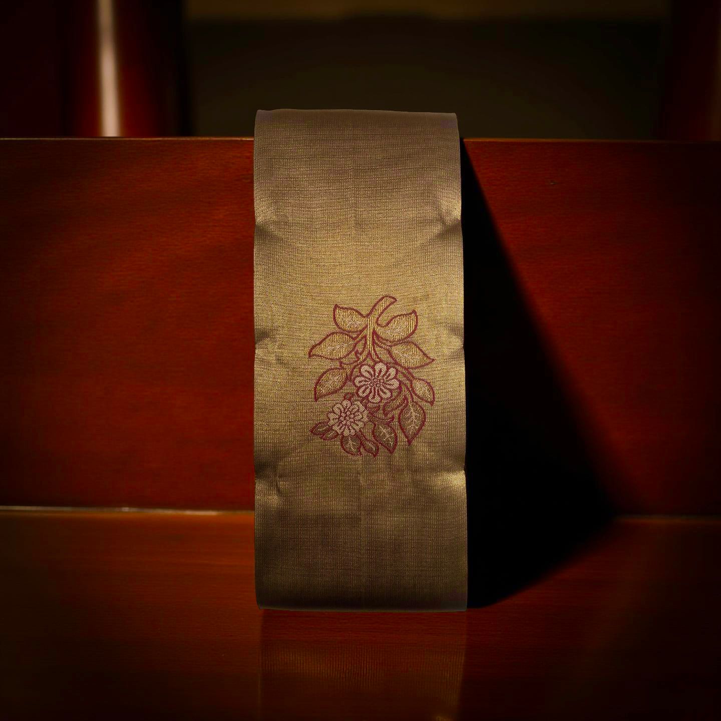 This exquisite Kubera Pattu saree showcases a beautiful khaki-colored body, intricately patterned with delicate floral designs that flow gracefully across the fabric. The rich khaki is perfectly framed by a classic burgundy border, adding a touch of traditional grandeur. Known for its luxurious texture and skilled craftsmanship, this saree is an ideal choice for celebrations and formal events, blending natural elegance with timeless sophistication.