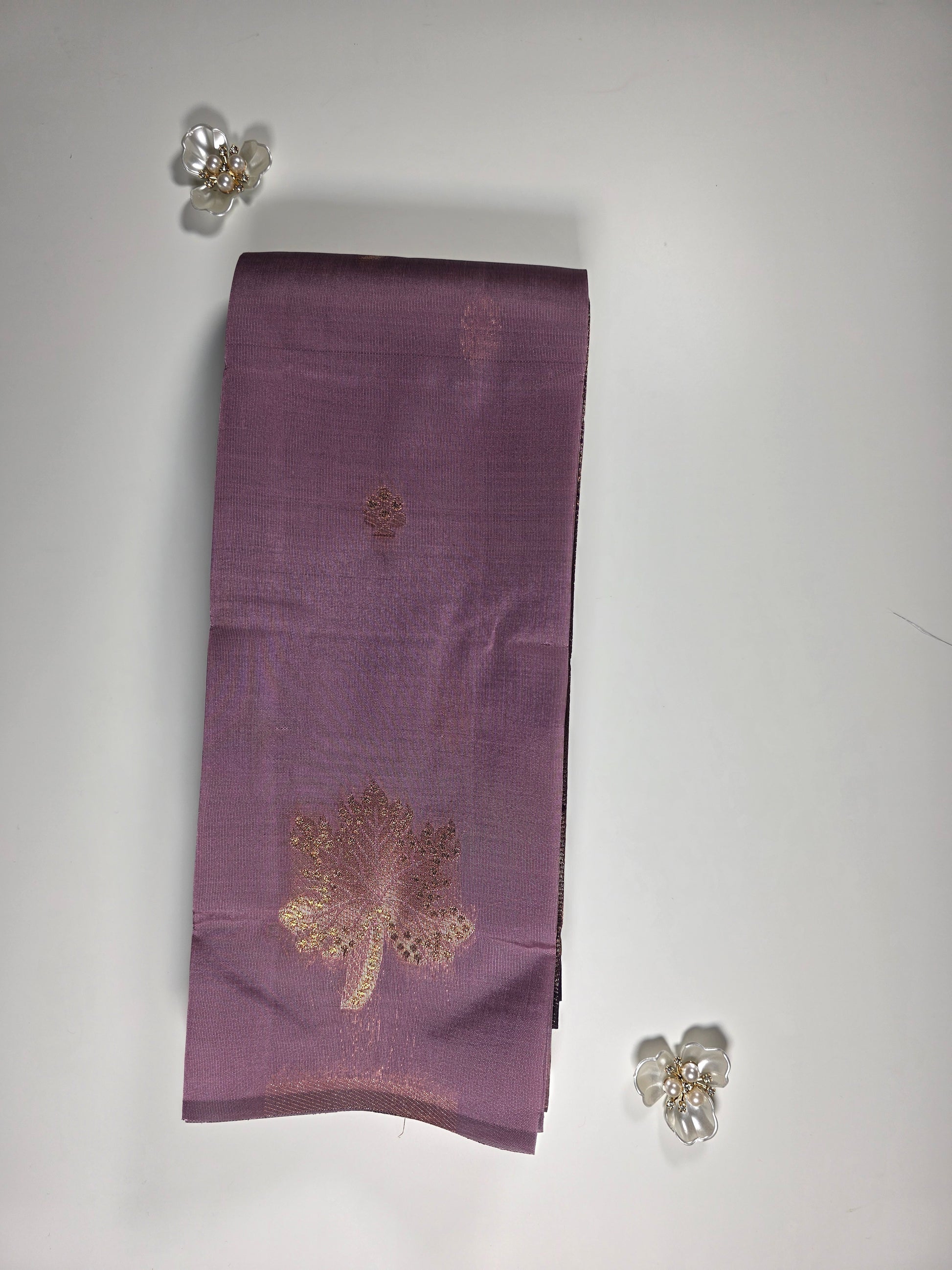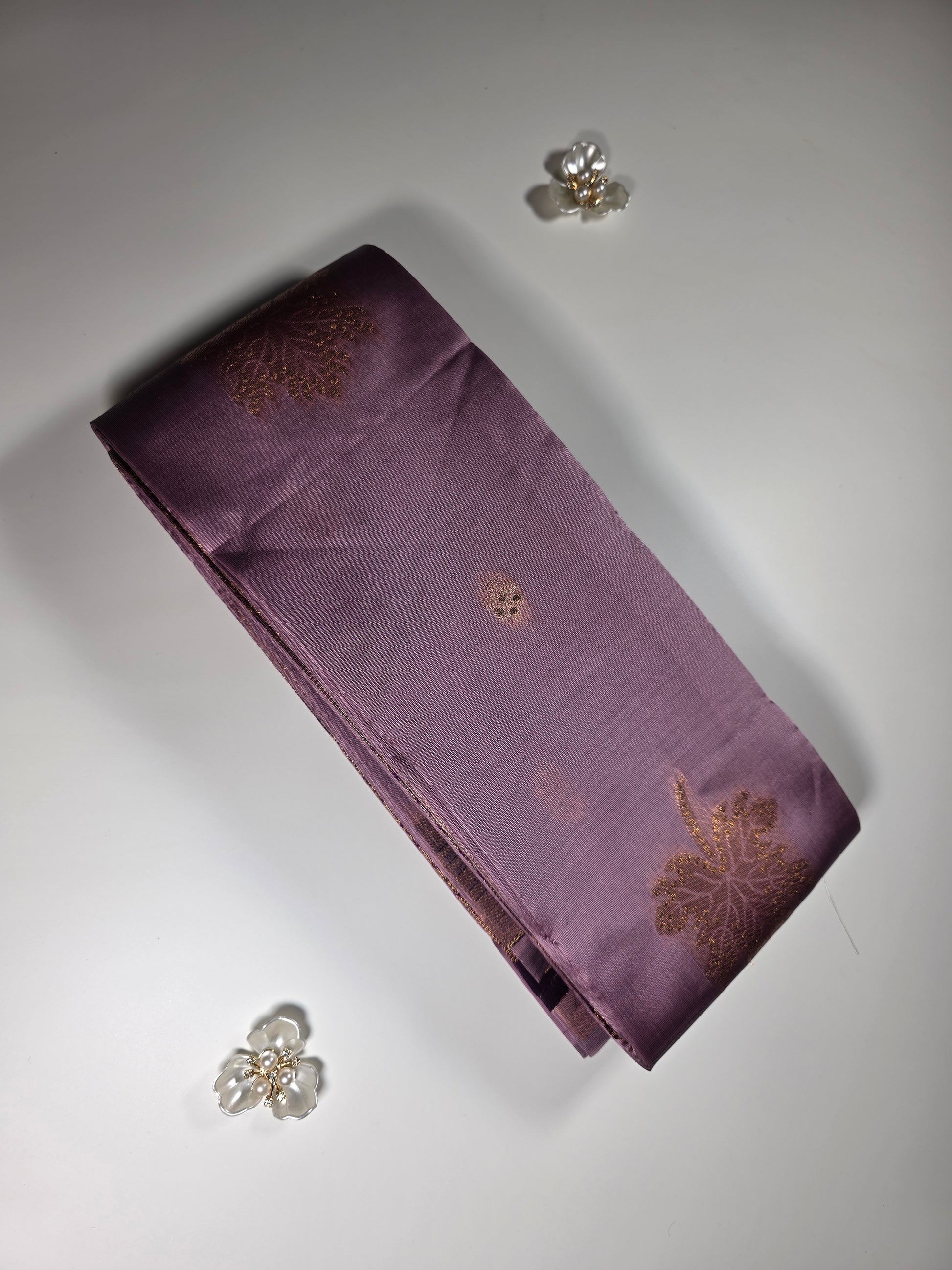 Soft silk saree in delicate light purple or lavender with elegant gold saree weaving.