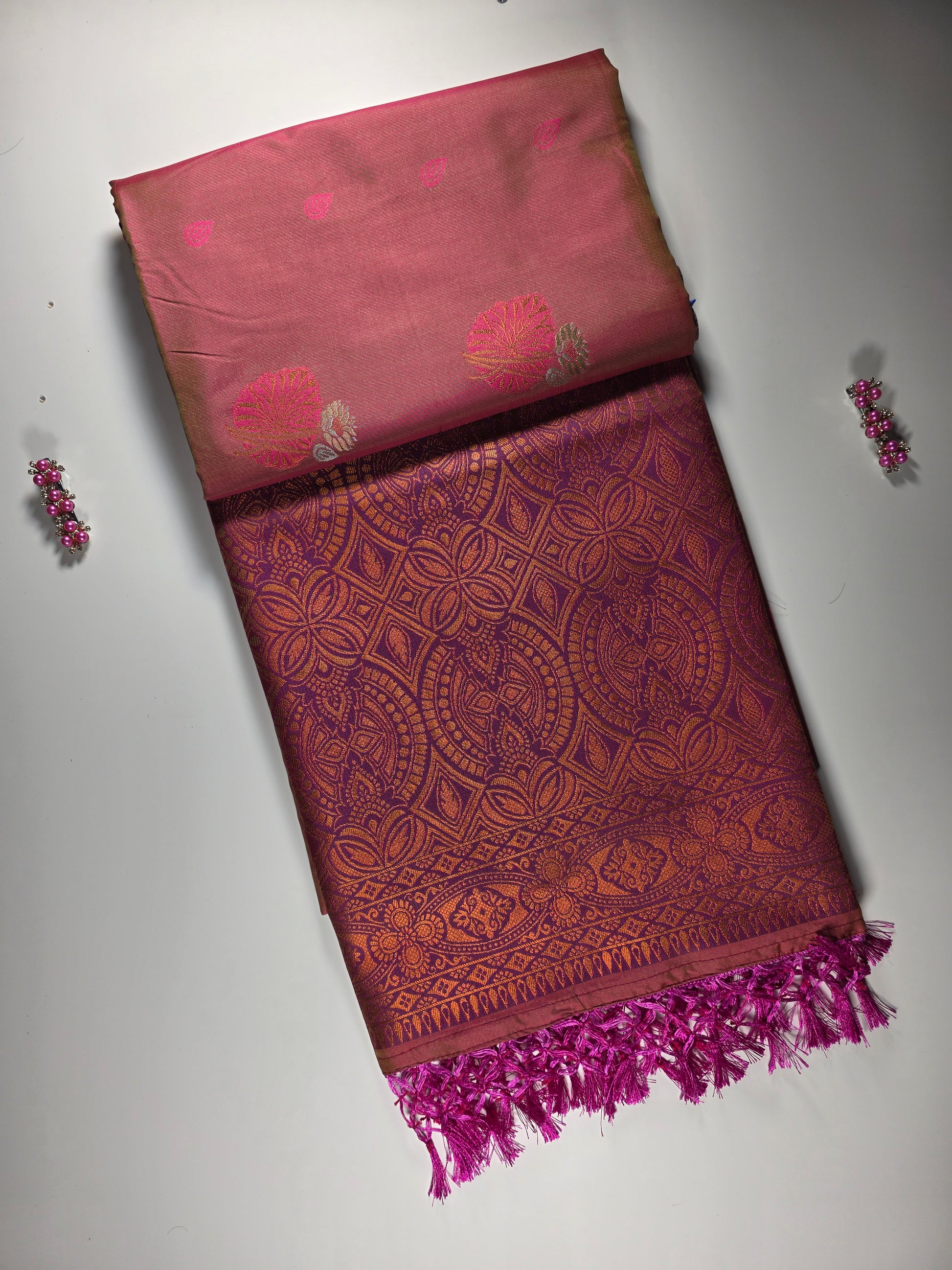 orange silk saree with royal pink border.
