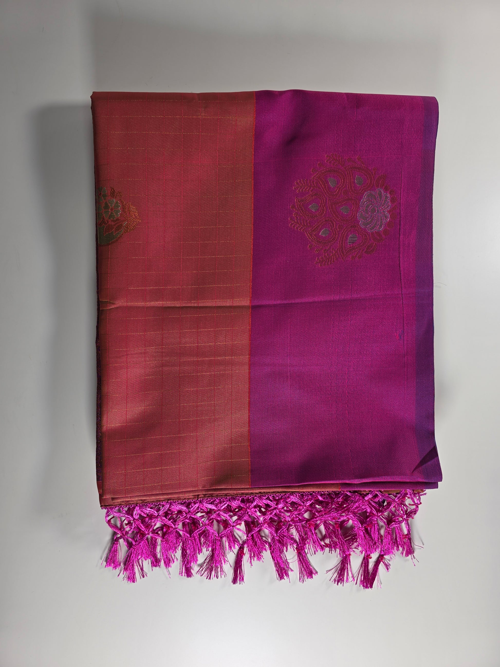 This image presents a magnificent saree, featuring a vibrant orange body that exudes warmth and radiance. The elegance of the saree is greatly enhanced by a striking, wide border in a rich, royal pink, which beautifully frames the entire garment. The "pallu" (the decorative end-piece of the saree) would likely carry forward this royal pink, potentially adorned with intricate gold or silver zari work, or detailed traditional motifs that complement both the orange and pink. The fabric appears to drape gracefully, suggesting a luxurious soft silk material. This combination of orange and royal pink creates a sophisticated and eye-catching ensemble, perfect for festive occasions or elegant gatherings.